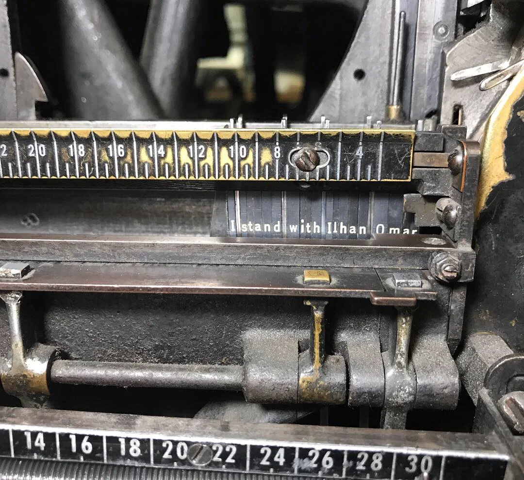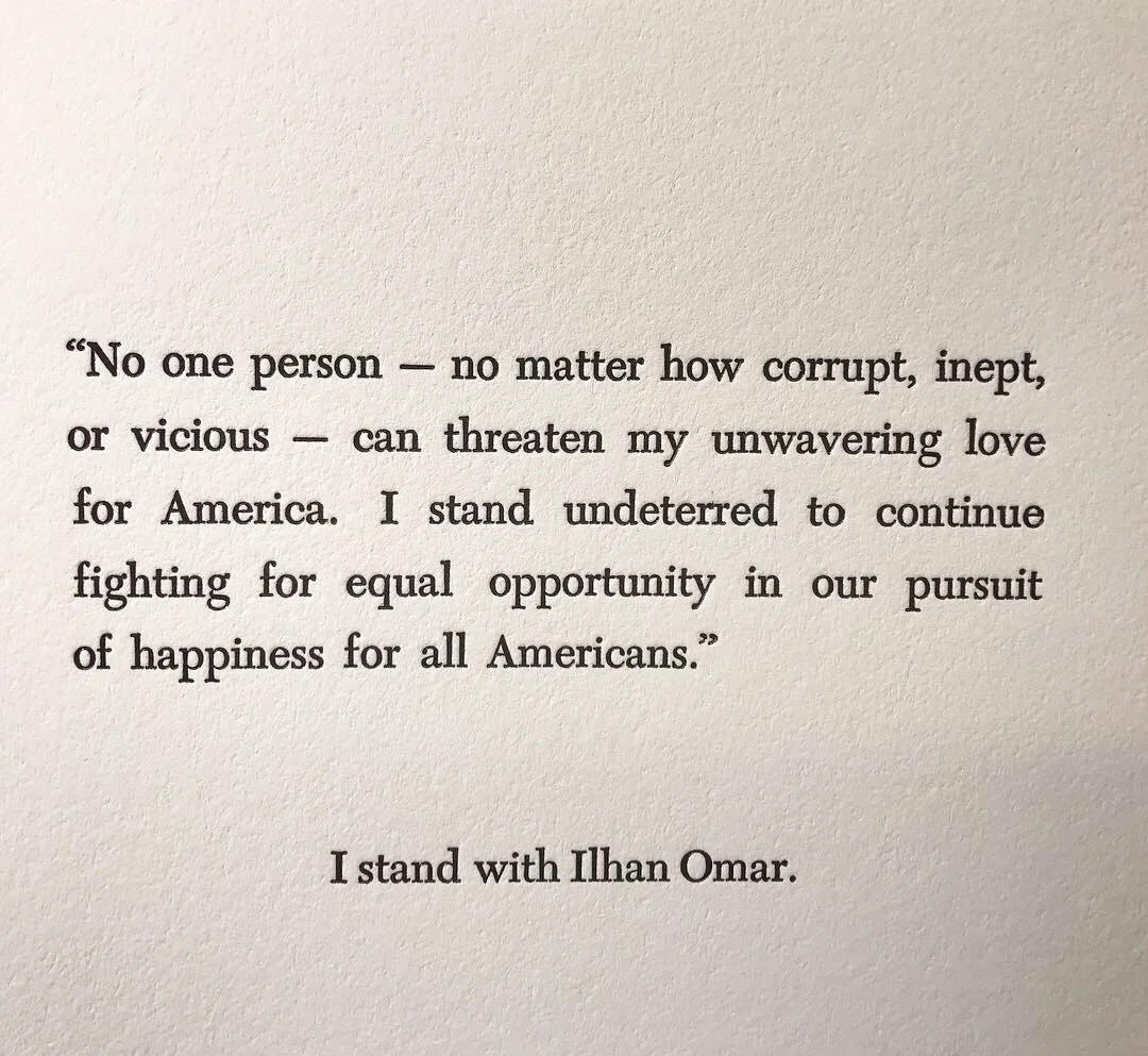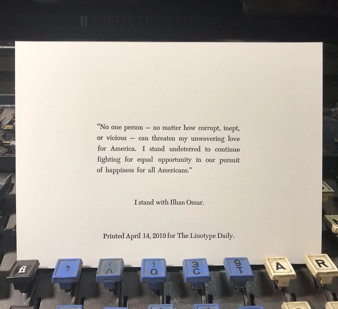 Day 45. I stand with Ilhan Omar. Cast in 12pt Caledonia, printed on 100% cotton Cranes Kid-finish 134# cover. Quote from Minnesota Congresswoman Ilhan Omar, via her twitter feed https://twitter.com/IlhanMN. For further reading,