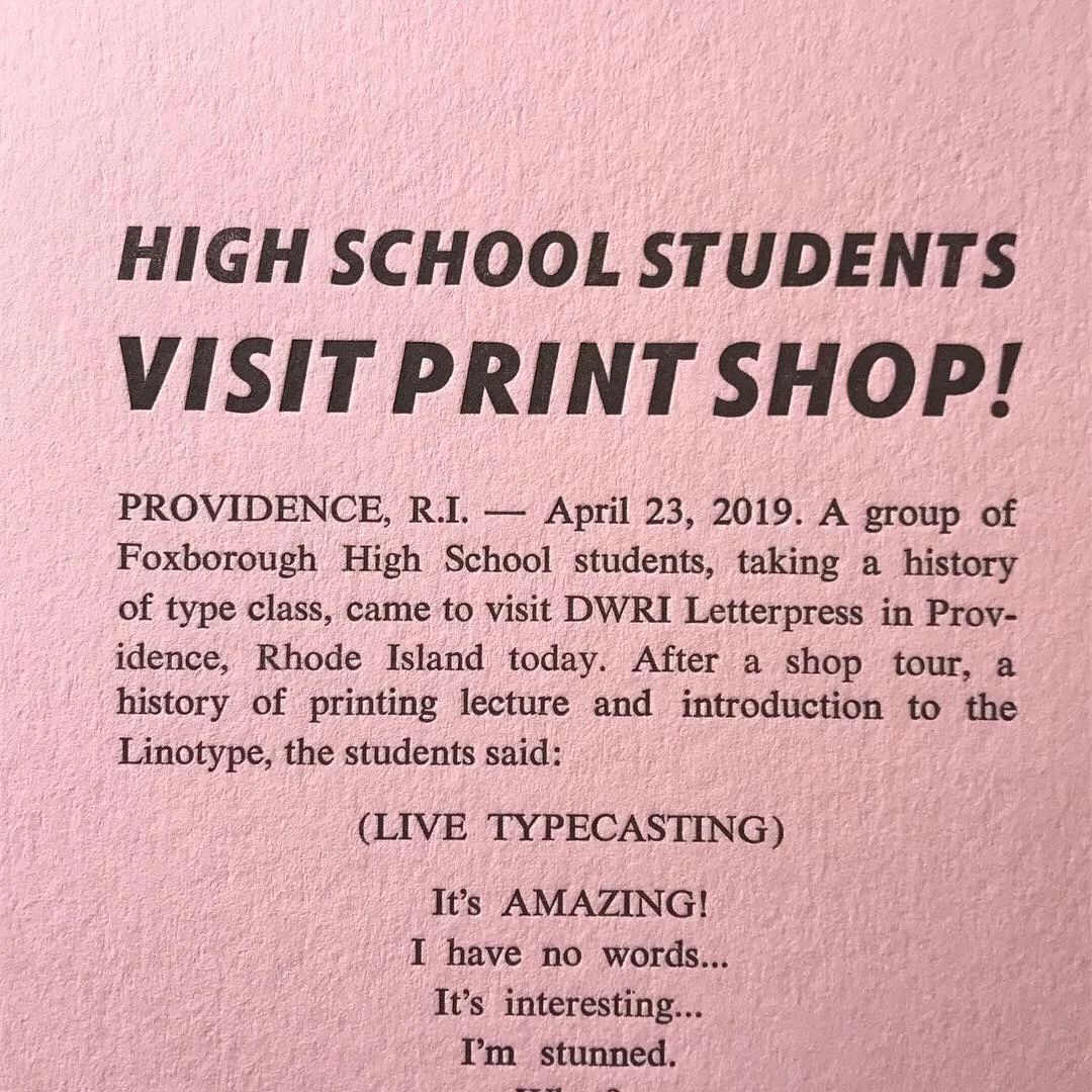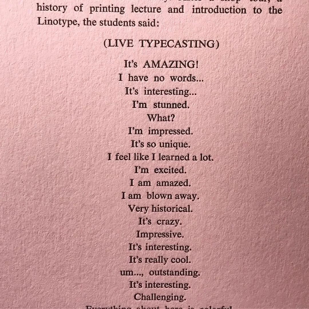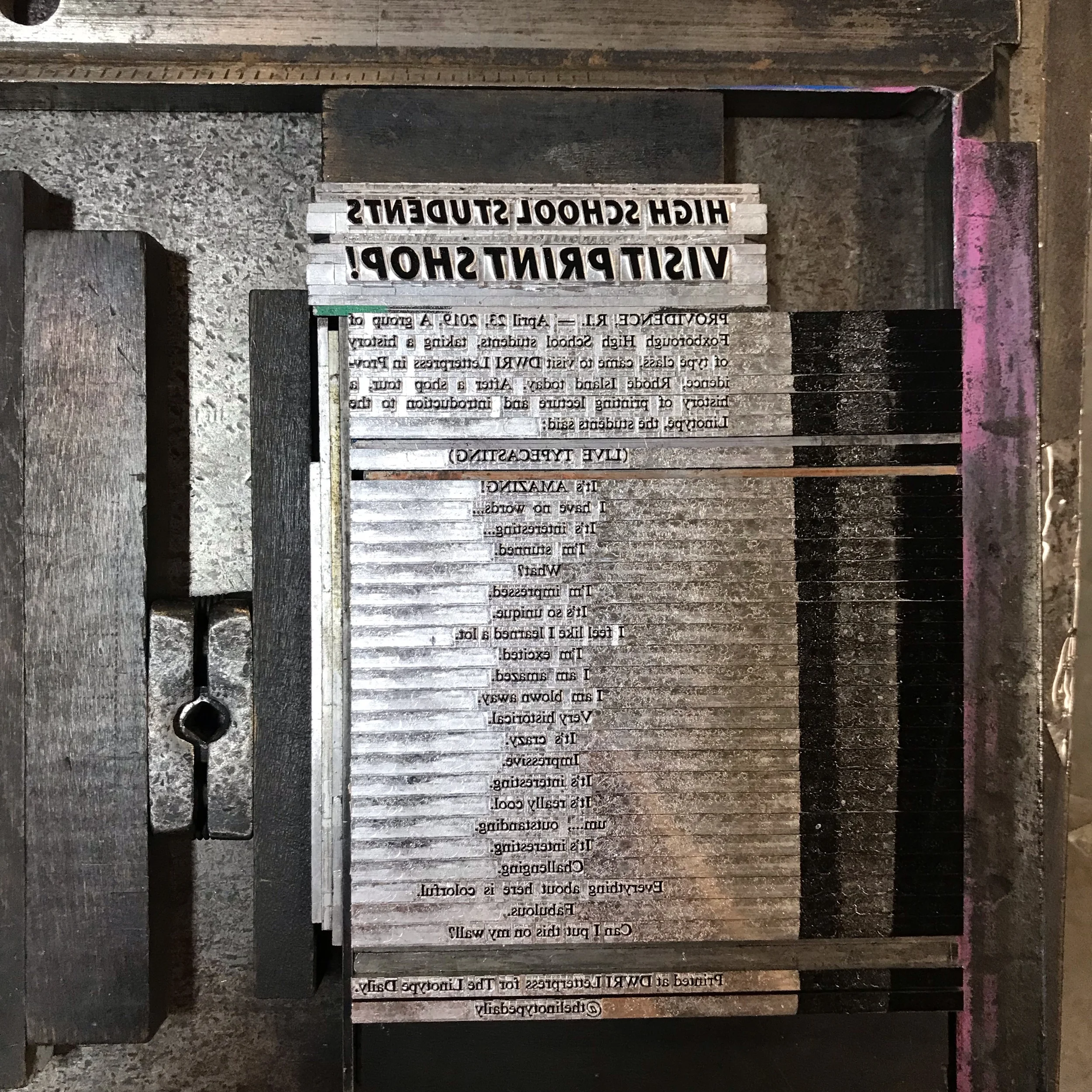 Day 54. Live typecasting! Cast in 9pt Times Roman (live while demonstrating the Linotype), and 18 and 24pt Tempo Heavy Italic (beforehand on Ludlow).