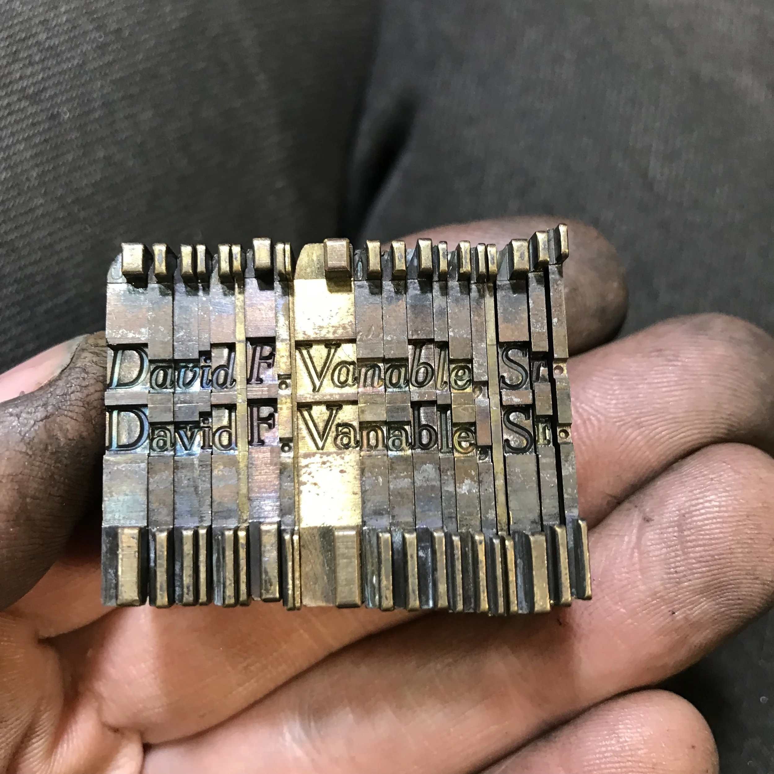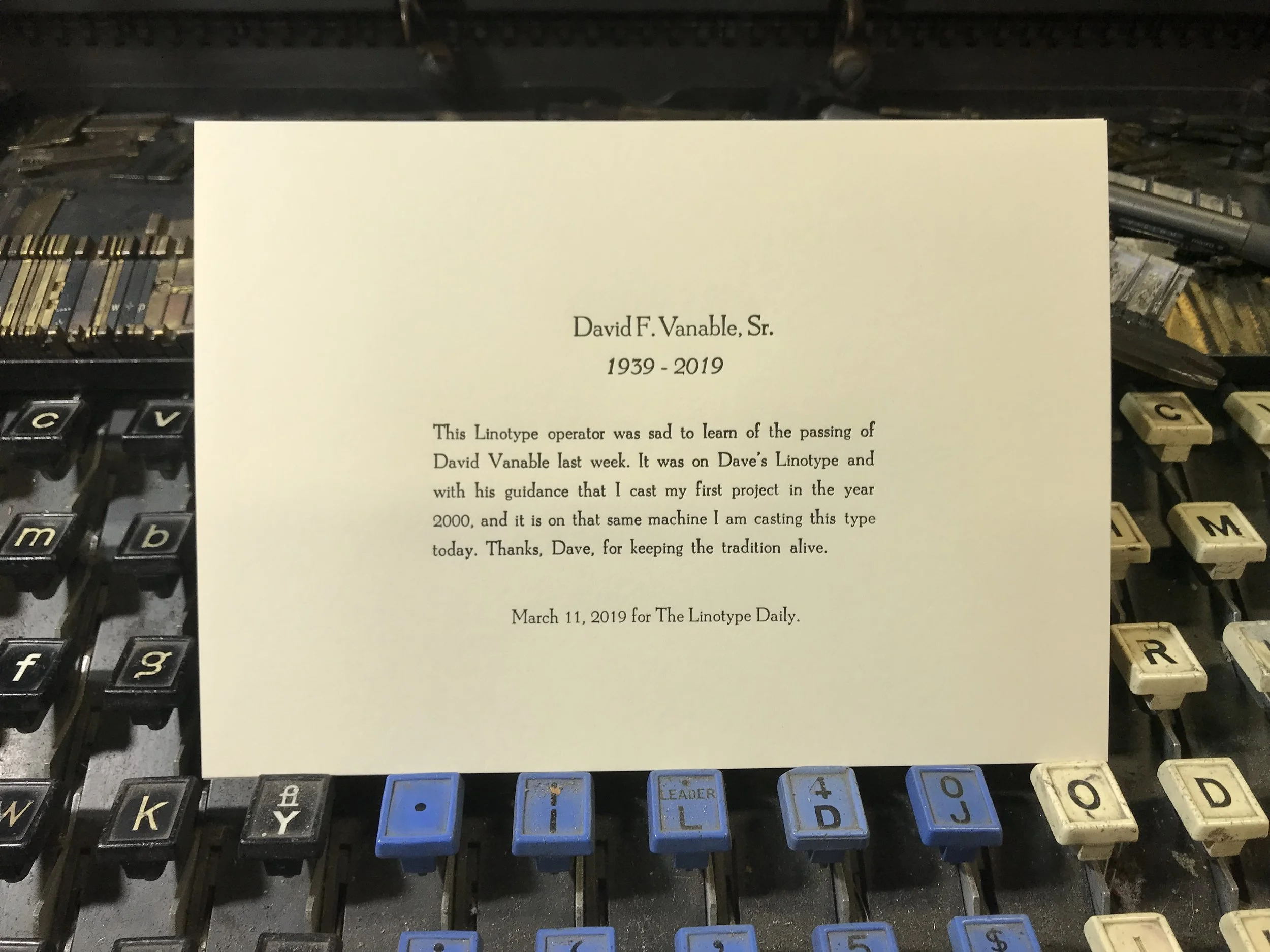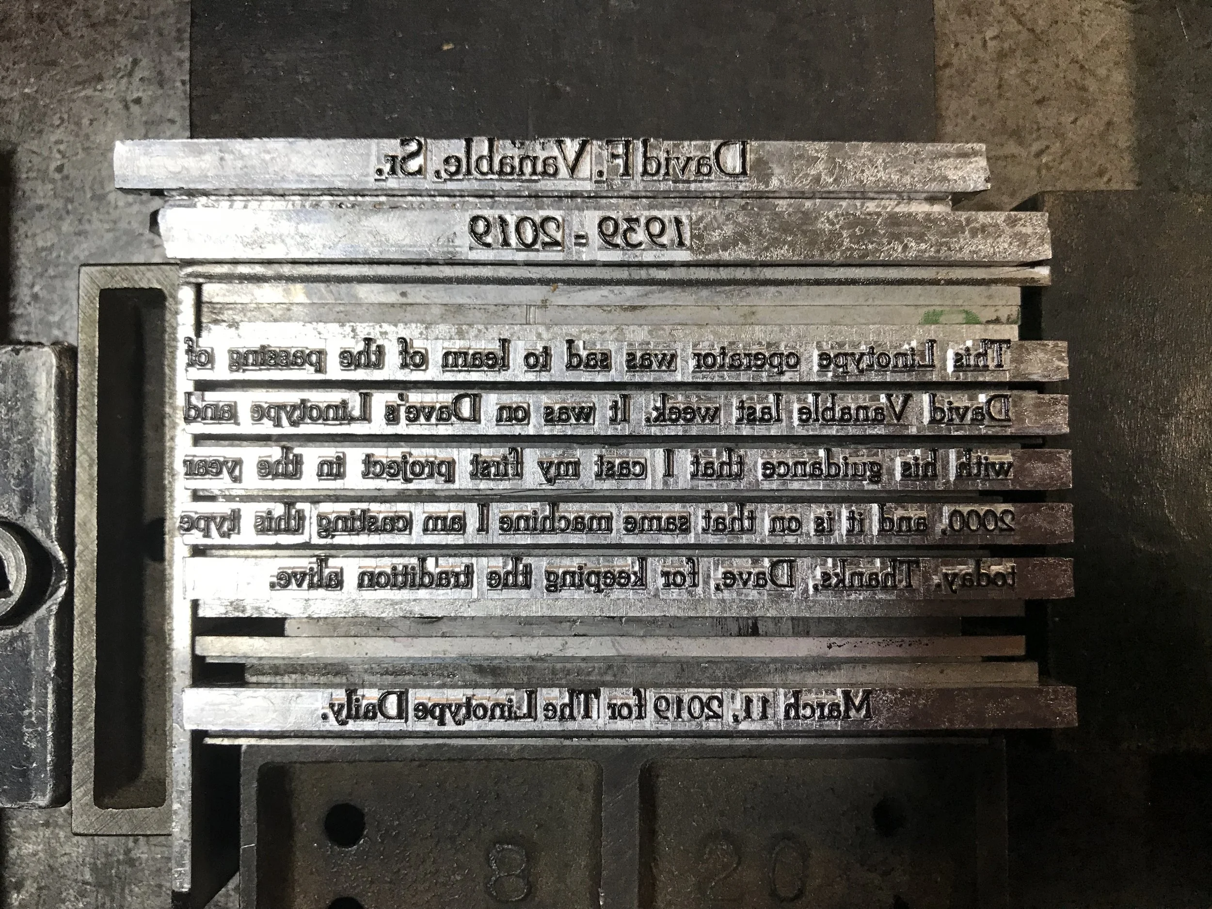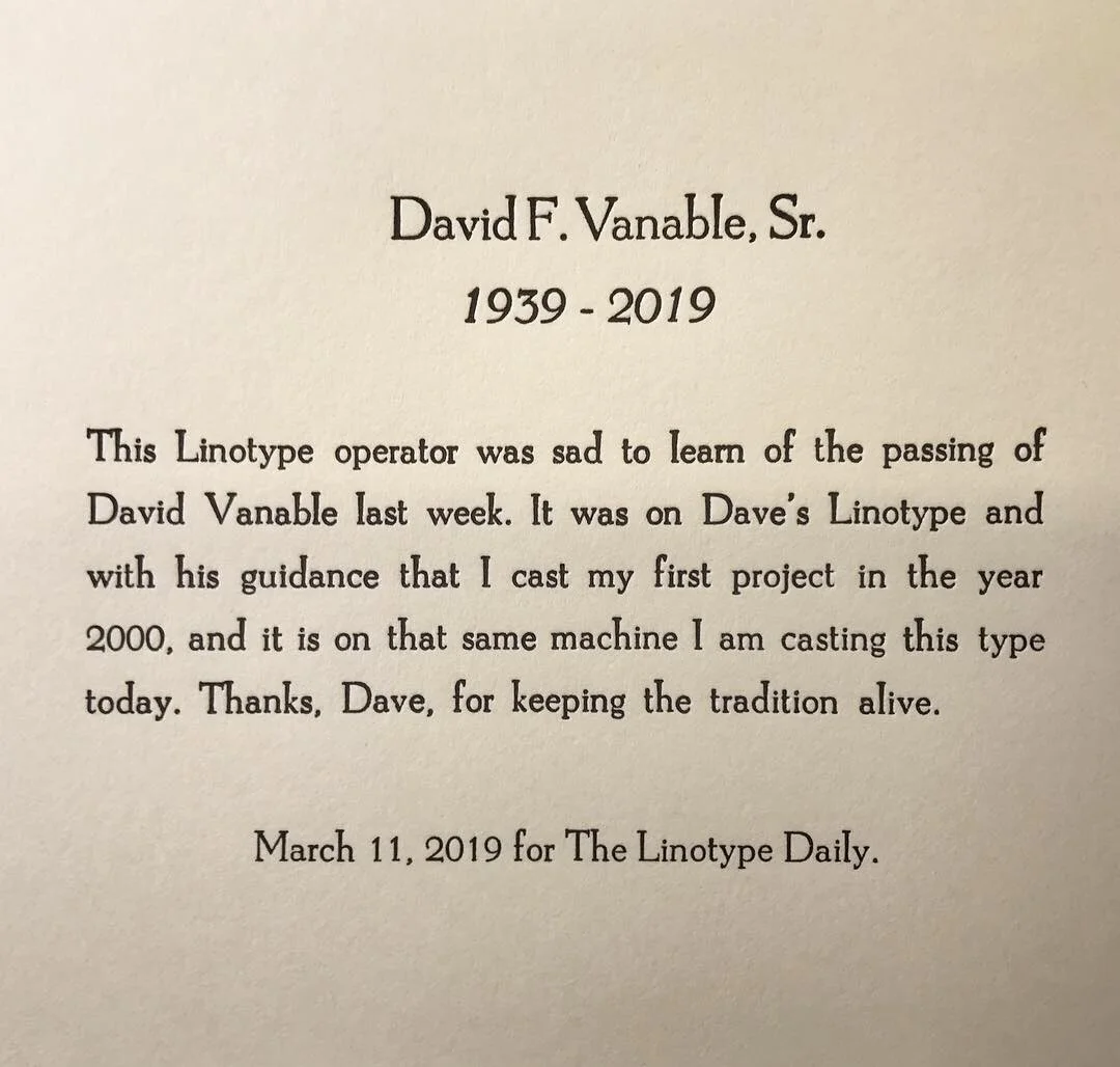 Day 11. Cast in 10 and 14pt Egmont Light. Printed on 67# Exact Vellum Bristol Natural. More of how the Linotype deals with ligatures on bottom right, notice the Va single matrix. Printed in memory of David Vanable, whose Linotype much of this work is being cast on.